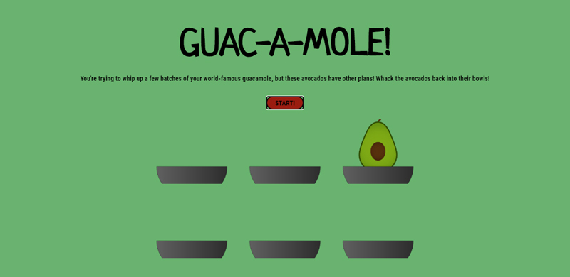 You’re trying to whip up a few batches of your world-famous guacamole, but these avocados have other plans! Whack the avocados back into their bowls! Artwork created in Adobe Illustrator, game powered by vanilla JS.
