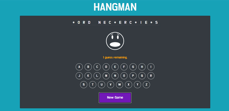 You have a handful of guesses to correctly guess the mystery word. Make them count and keep smiling! Deployed with Netlify. Artwork created in Adobe Illustrator, UI built with Bootstrap, game powered by vanilla JS.