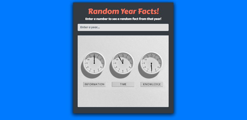Type in a number to learn a random fact about the corresponding year! UI built with Bootstrap, random facts accessed via the Numbers API.